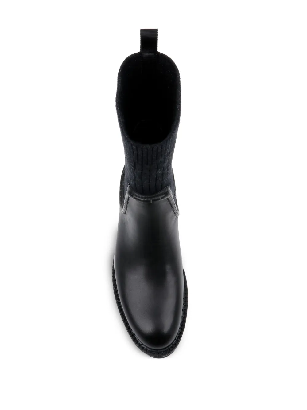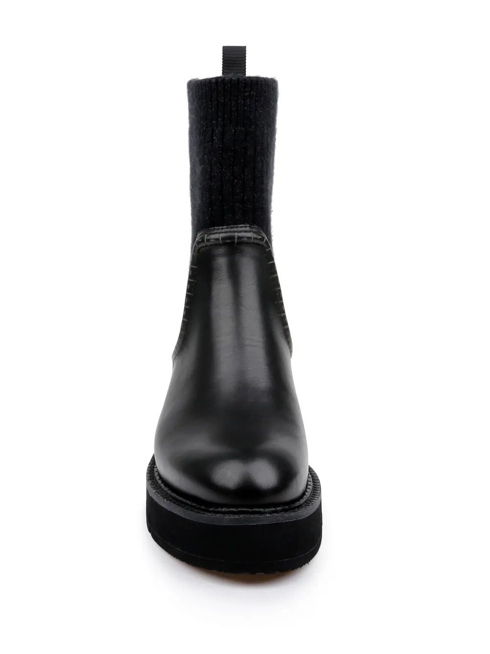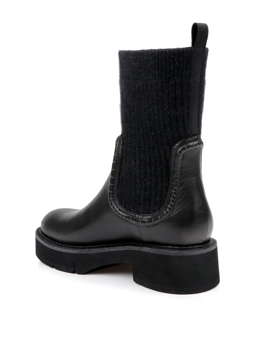 zwart nappaleer elastische enkels slip-on stijl contrasterende stiksels dubbele ritssluiting ronde neus dikke rubberen zool blokhak