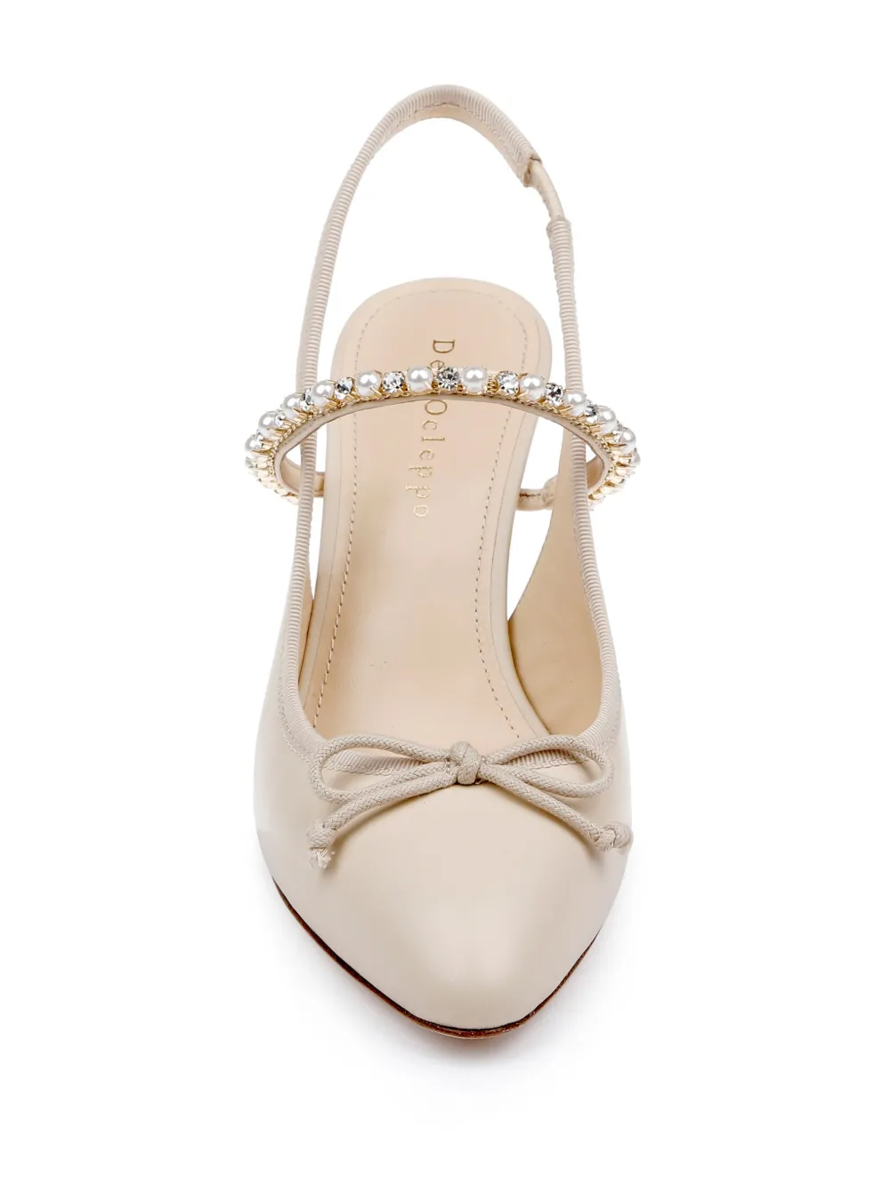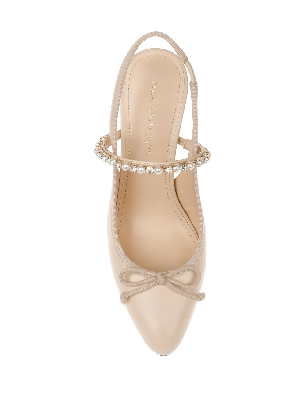 lichtbeige nappaleer verfraaid met imitatieparels verfraaid met bergkristallen elastische slingback bandje hoge stilettohak puntige neus