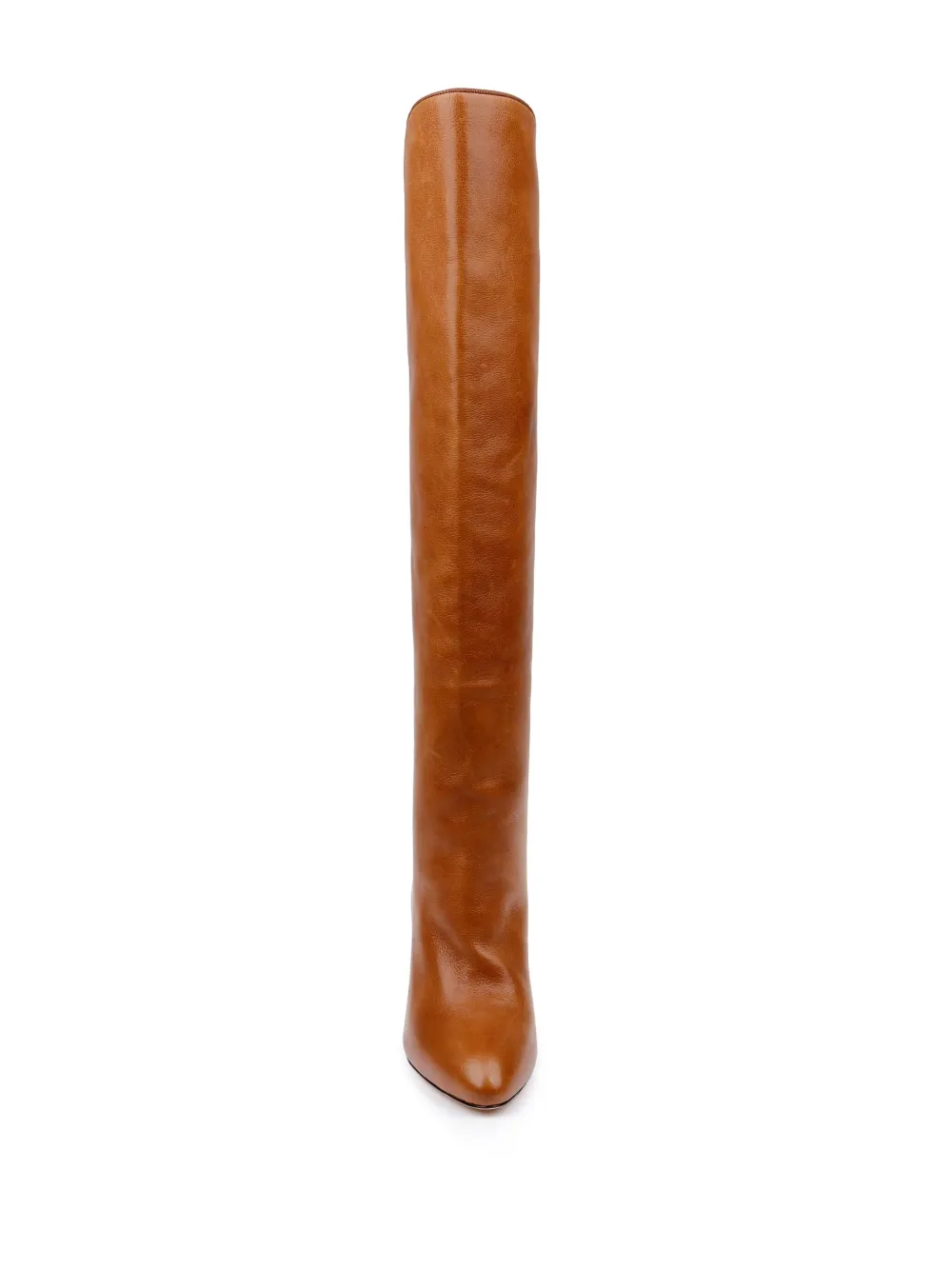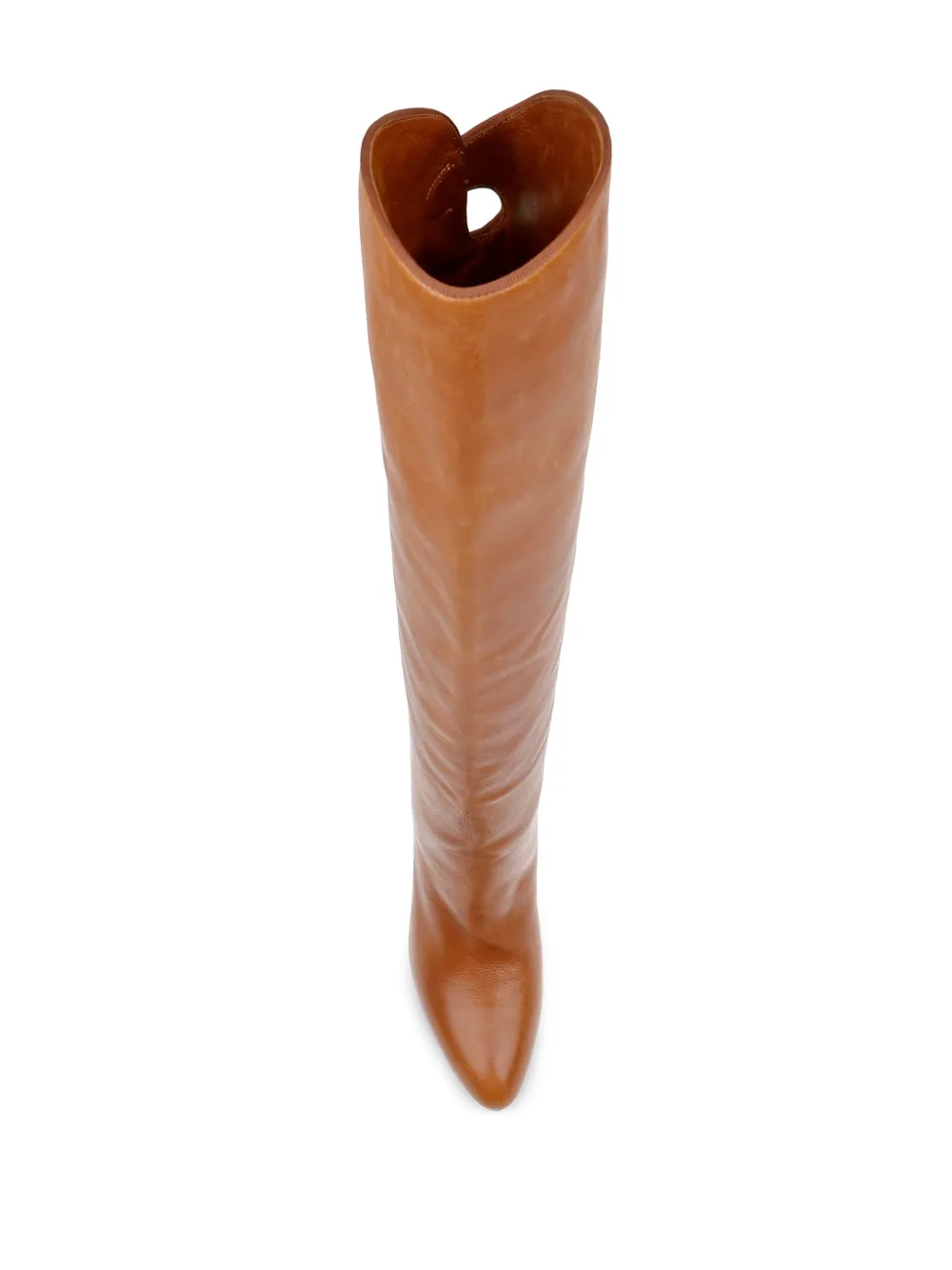 camelbruin kalfsleer drukknoopsluiting aan de achterkant kittenhak lengte tot boven de knie puntige neus slip-on stijl leren buitenzool