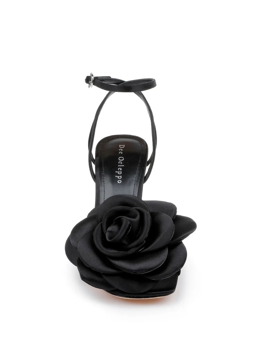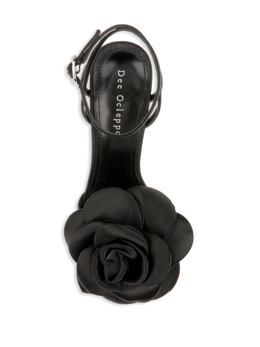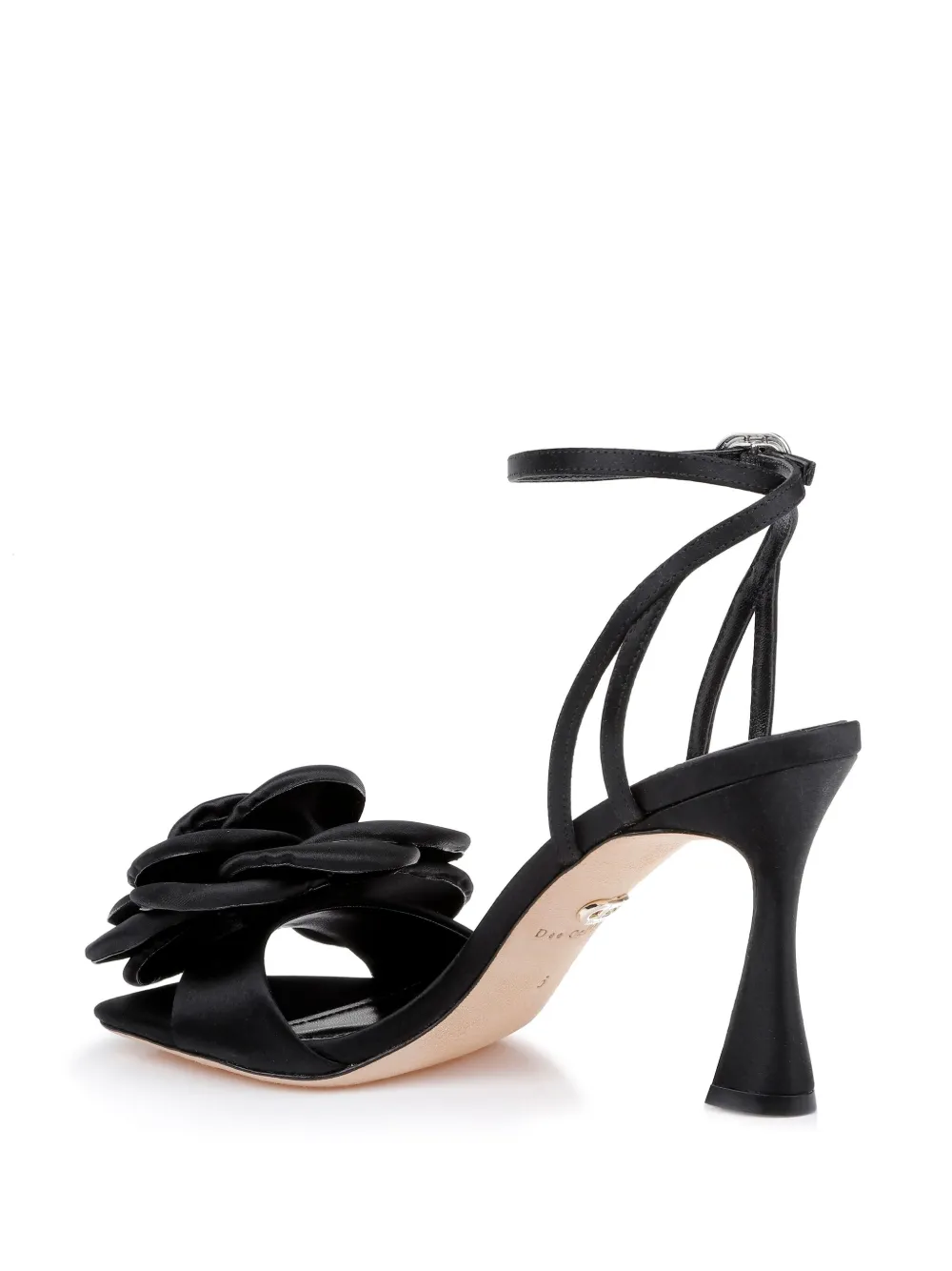 zwart satijn/leer bloemenpatch slingback bandje met gespsluiting vierkante open neus leren binnenzool met logo hoge hak