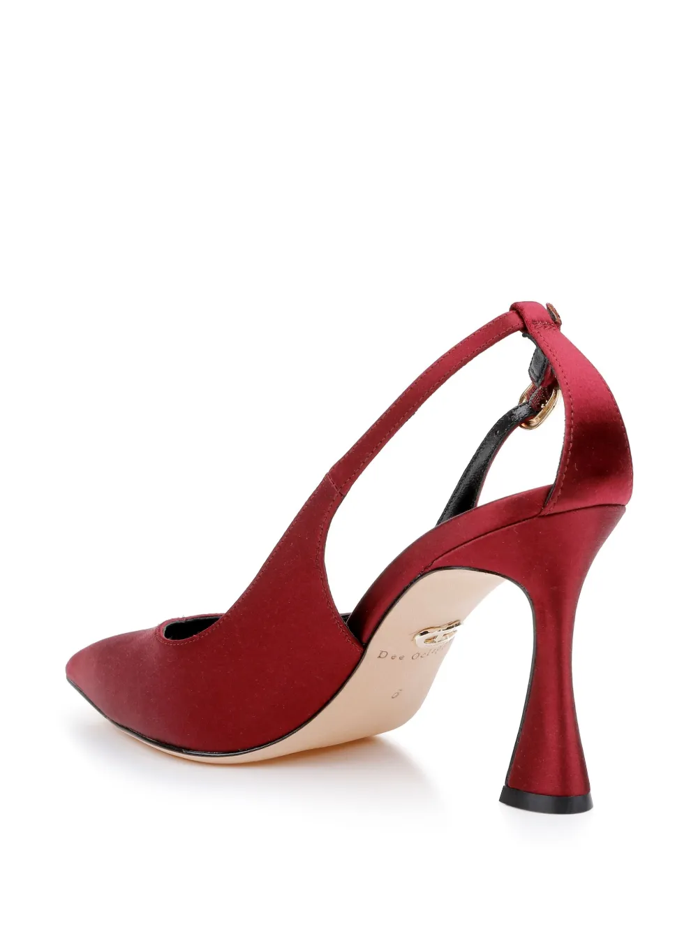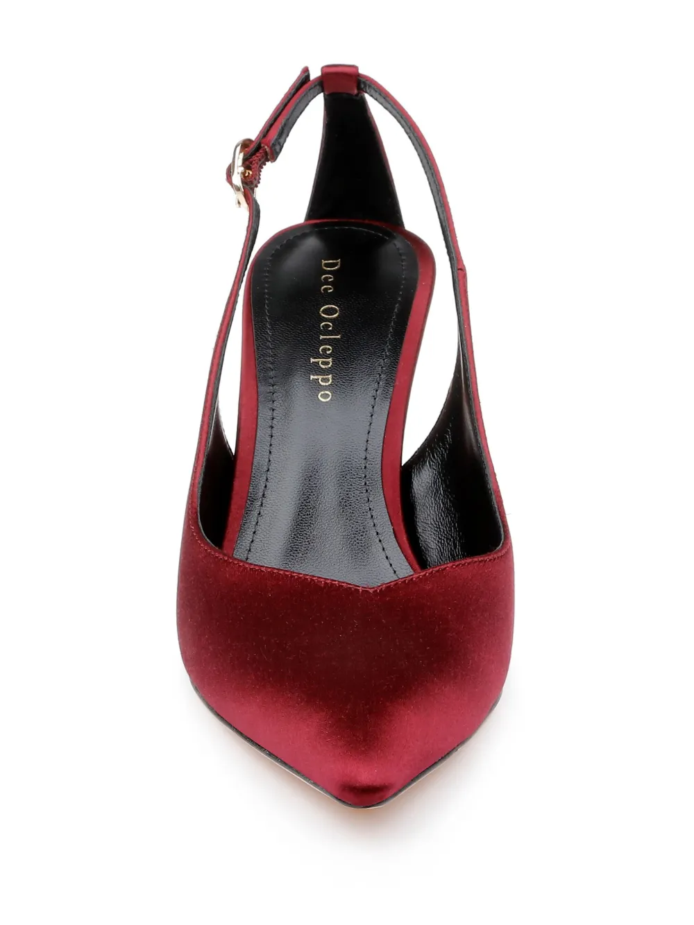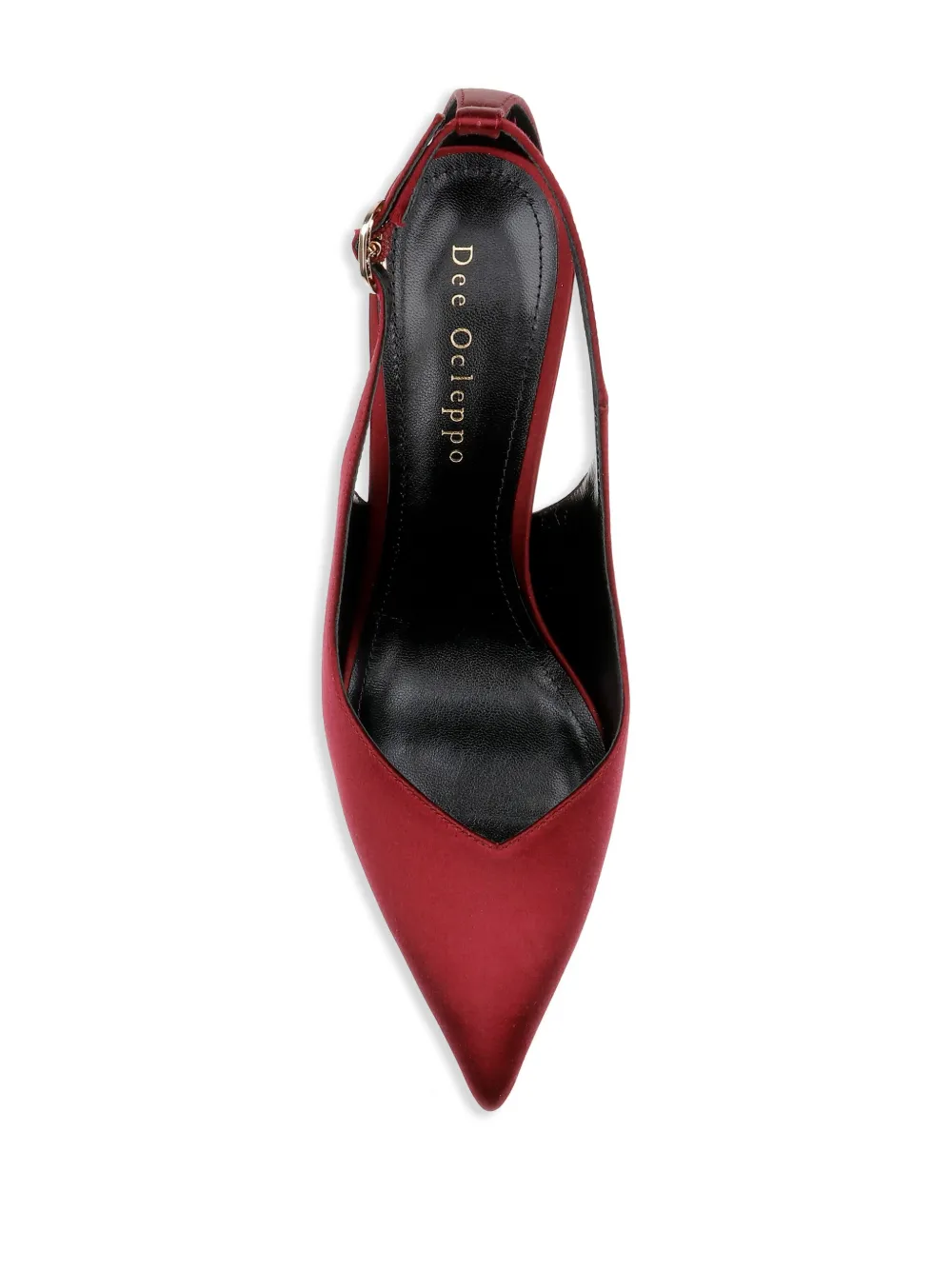 bloedrood zijden satijn puntige neus enkelbandje met gespsluiting leren binnenzool met logo hoge hak leren zool