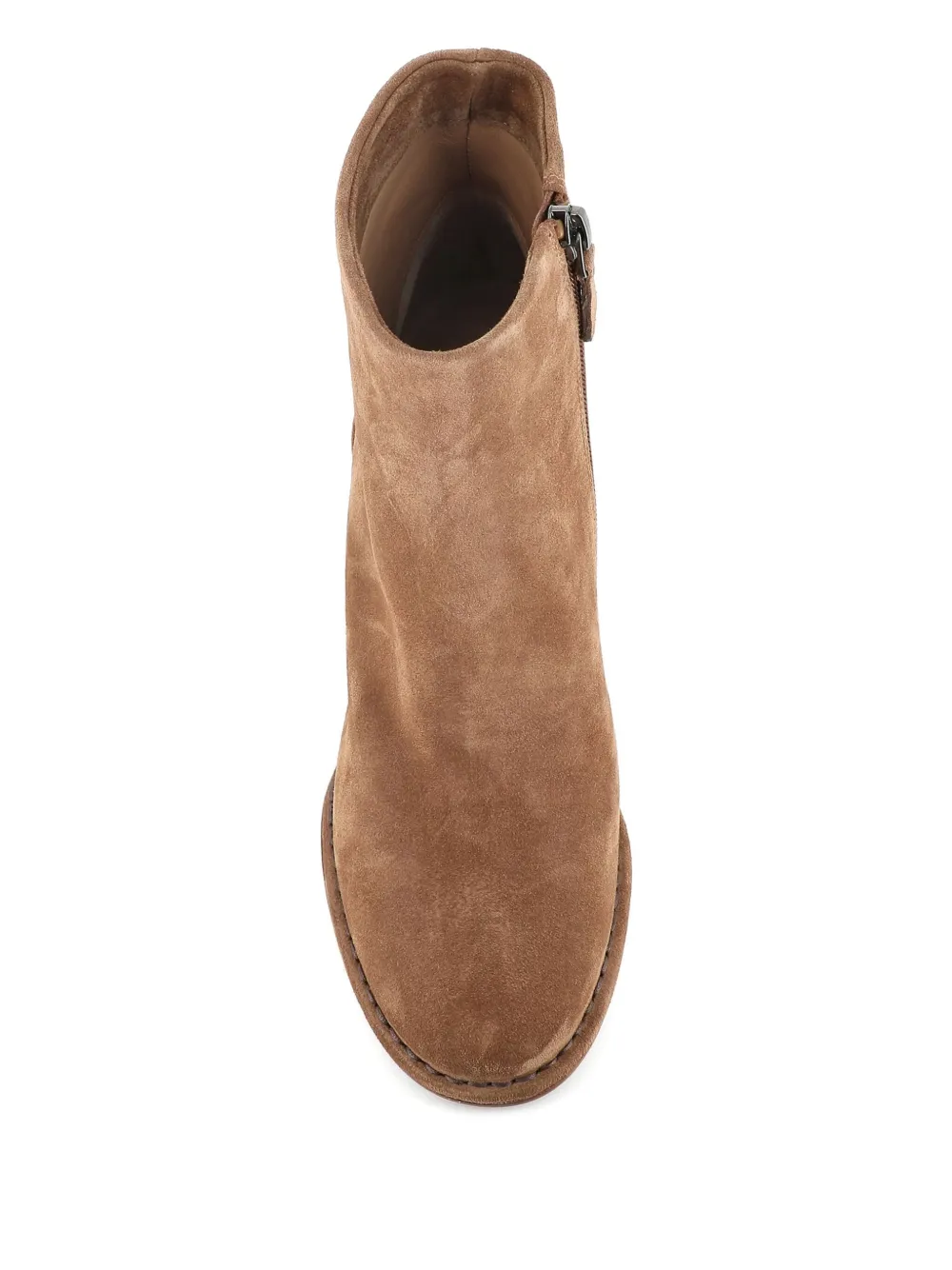 bruin sude ritssluiting blokhak puntige neus zichtbare stiksels