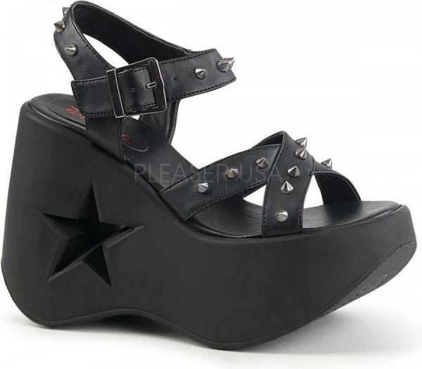 Demonia. Een zwarte sandaal met sleehak, spike studs en een uitgesneden ster detail.Materiaal:PU/TPU – Semi-Polyurethaan – Polyurethaan