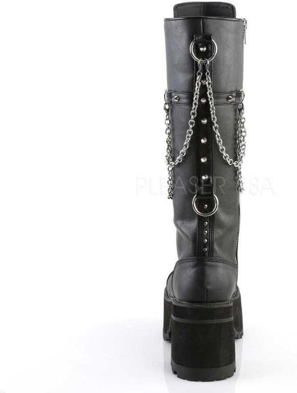 Demonia. Zwarte nep leren unisex knie hoge laarzen met ketting detail aan de zijkanten en studs met O-ringen aan de achterkant.Materiaal:PU/TPU – Polyurethaan – Thermoplastisch rubber[ Gothic, Metal ]