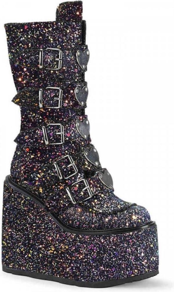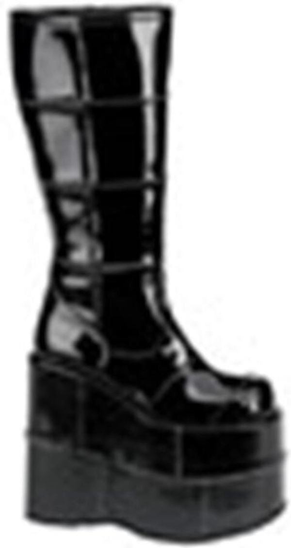 Demonia. Een lak zwarte laars met zwarte details. Plateau zool 7 inch = 17.78 cm.Materiaal:PU/TPU – Stof – Polyurethaan – Thermoplastisch rubber[ Schoenen in allerlei stijlen zoals laarzen, creepers, pumps, stiletto’s, vegan, sleehakken, steampunk, gothic, punk, studs, emo, grunge, pinup, vintage, retro, metal, rock, edgy ]